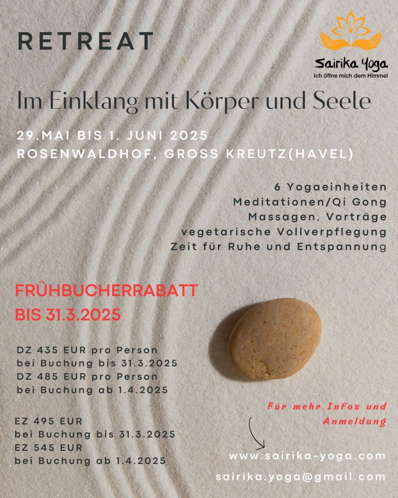 Die Freude ist groß! In 2026 wird es erstmalig zwei Sairika- Retreats geben und ich bin auch wieder als Yogalehrerin dabei. Wir haben einen ganz besonderen Ort gefunden, wo wir gemeinsam praktizieren und entspannen werden – das Gutshaus Gottin in Warnkenhagen in Mecklenburg-Vorpommern.